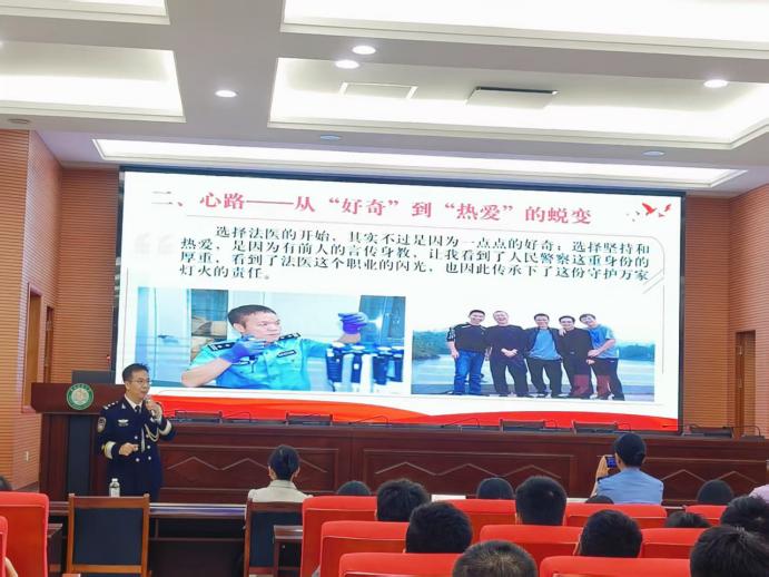 赵必锋以“从白大褂到蓝盾牌——临床医学生跨界法医之路”为题,结合自身成长经历,为在场学子描绘了一幅充满挑战与使命的职业生涯画卷。分享会上,赵必锋表示,法医并非仅仅是影视剧中神秘的“尸语者”,更是身着“蓝盾牌”警服、捍卫司法公正的“无声真相守护者”。回顾自己的选择,他坦言,最初只是对法医世界充满“好奇”。然而,在深入了解和学习的过程中,这种浅层的兴趣逐渐升华为一份沉甸甸的“热爱”。正是这份热爱,支撑他完成了从临床医学舒适区向法医挑战区的关键跨越。面对未来的学弟学妹,他强调,扎实的医学基础是法医的立身之本,学业的准备不仅是知识的积累,更是严谨科学态度的培养。关于毕业选择,他鼓励大家打破思维定式,勇敢探索多元化的职业路径。他特别指出,医学生的未来绝非仅有临床一条路,法医、公共卫生、医学研究、医疗科技等领域同样是一片广阔的天地,等待着有志青年去“突围”。他号召广大青年学子,无论未来选择哪一条道路,都应将自己的理想融入国家发展的浪潮中,用专业知识与辛勤汗水,肩负起时代赋予的重任。