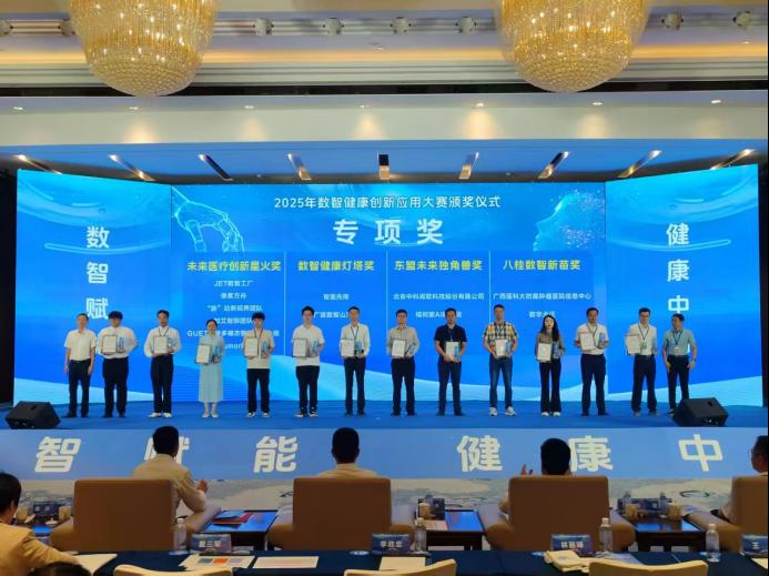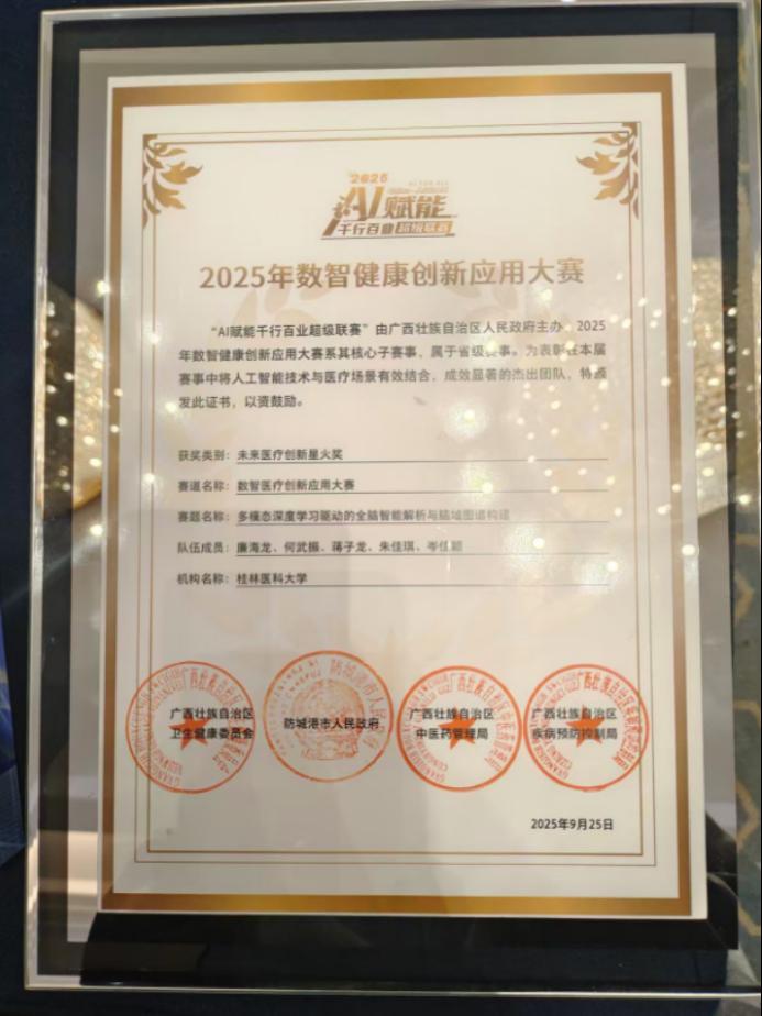 近日,2025年数智健康创新应用大赛颁奖仪式在广西防城港市举行。该赛事是自治区“AI赋能千行百业”超级联赛的重要组成部分,以“数智赋能,健康中国”为主题,设立数智医疗、数智就医、数智中医药、数智疾控四个赛道。我校人工智能医学院在本届大赛中喜获佳绩,彰显了学校在医学人工智能领域的前沿布局与创新实力。