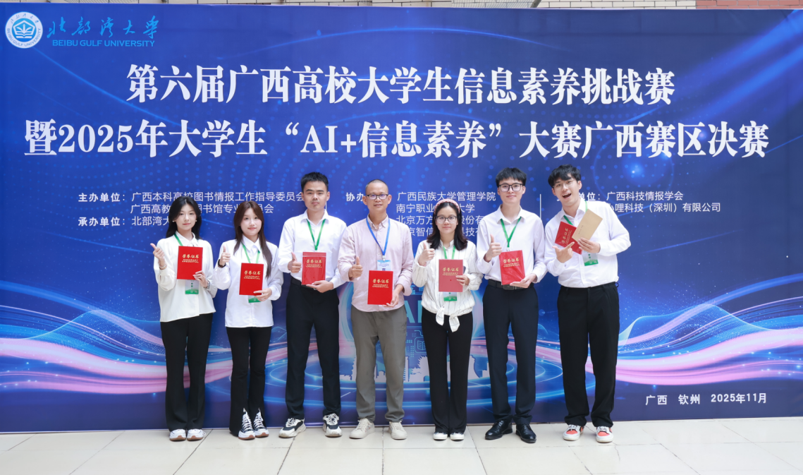 近日,第六届广西高校大学生信息素养挑战赛暨2025年大学生“AI +信息素养”大赛广西赛区决赛在北部湾大学顺利举行。本届大赛设立高职、本科生、研究生赛道,共有78所高校,逾 2.3 万人参加初赛,最终选拔出44支精英队伍参与现场决赛,赛事规模与影响力创历史新高。我校在比赛中荣获多项荣誉。
