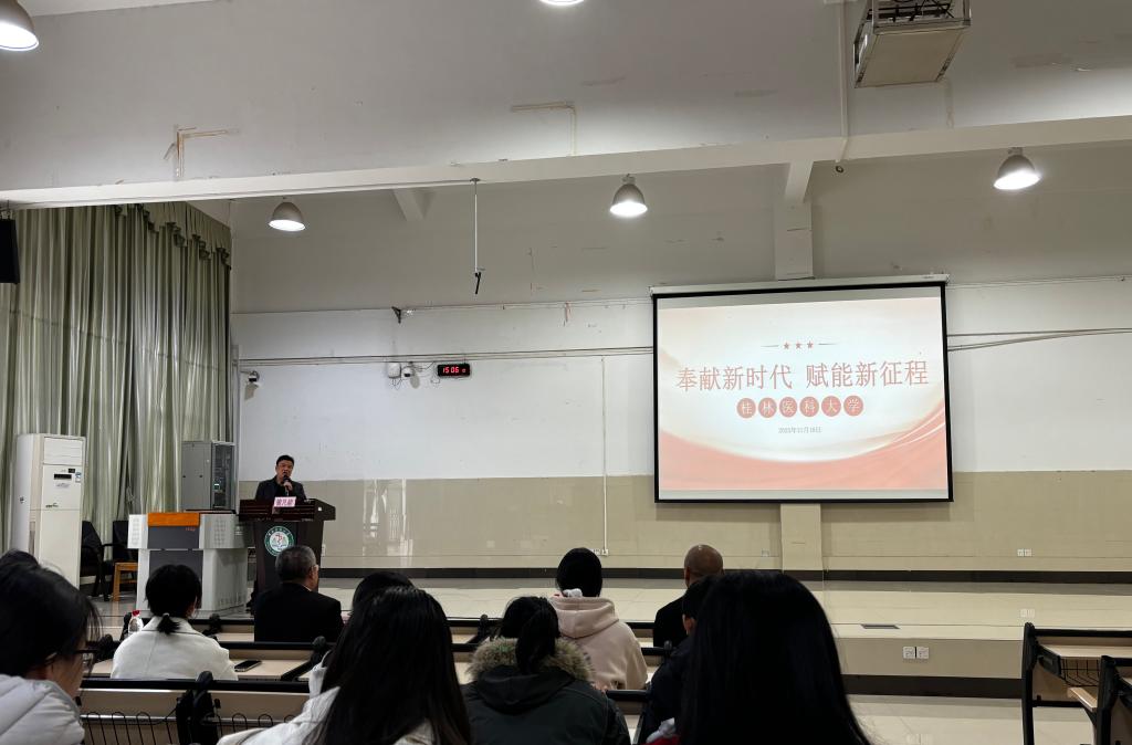 11月18日,我校2025年度秋季学期“关心下一代”讲坛系列活动(第三期)在临桂校区教学南楼多功能报告厅举行。活动由关心下一代工作委员会与学生工作(部)处联合主办、康复医学系承办,基础医学院、公共卫生学院协办。原公共卫生学院党委书记曾凡能同志主讲,学校离退处副处长骆泽盛、康复医学系副主任王群及各学院300余名同学参加。