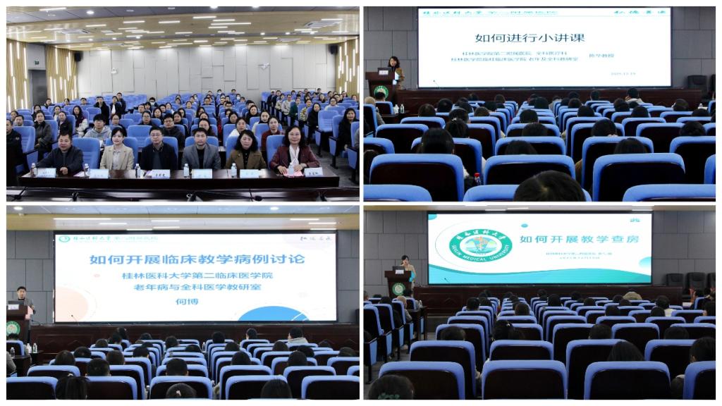 本次培训邀请了第二附属医院多位教学经验丰富的专家进行授课,内容紧密围绕实践教学核心环节,设计务实、针对性强。陈华教授以《如何开展临床教学小讲课》为题,深入浅出地分享了小讲课的设计要点与实施技巧,强调教学内容应“小而精、深而实”;何博教授作了《如何开展临床教学病例讨论》专题讲座,系统讲解了病例讨论的组织流程与教学逻辑,通过典型案例解析,以提升教师们培养学生临床思维的能力;黄仁相老师聚焦《如何开展教学查房》,从定义、准备、实施到复盘总结,全方位梳理了教学查房的规范步骤与常见问题对策,内容详实、可操作性强;唐建红教授结合多年教学管理经验,就《如何管理实习生》进行了系统交流,涵盖政策职责、院科两级管理、带教执行及质量监控等方面,为实习生的规范管理提供了清晰指引。整场培训节奏紧凑、内容饱满,参训教师全程专注,互动积极。