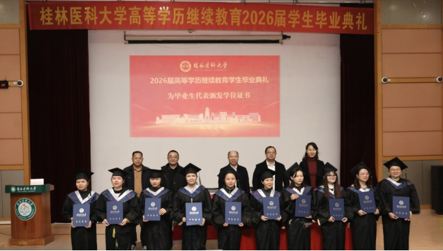 1月17日上午,桂林医科大学2026届高等学历继续教育学生毕业典礼在东城校区多功能报告厅举行,学校领导、师生代表及教学点代表等150余人参会。