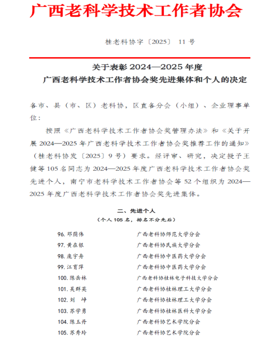日前,广西老科学技术工作者协会发布《关于表彰2024—2025年度广西老科学技术工作者协会奖先进集体和个人的决定》,我校退休教师苏学勇荣获2024—2025年度广西协会奖先进个人。