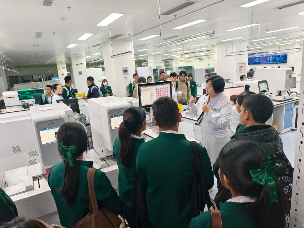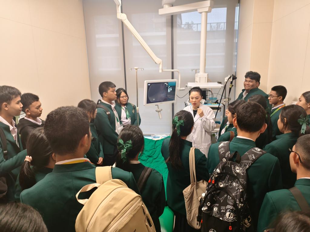 泰国师生先后参观了医院综合服务中心、放射科、检验科、消化内镜中心和广西细胞技术工程中心,实地感受我校第一附属医院舒适的康养环境、先进的医疗设备以及智能化、人性化的医疗服务理念。在综合服务中心,师生们了解了医院一站式便民服务体系,直观体验了院区高效便捷的就医流程。在放射科,师生们参观了先进医学影像设备,聆听了关于影像检查技术、诊断流程及精准诊疗应用的介绍,了解了高端影像设备在疾病筛查、精准诊断中的重要作用。在检验科,师生们参观了标准化检验实验室和全自动智能化检验设备的运行流程,了解了样本检测、质量管控、生物安全防护等全环节工作。在消化内镜中心,师生们参观了诊疗区、准备区、复苏区等功能区域,感受中心舒适、无菌规范的诊疗环境,了解先进内镜诊疗设备的应用及微创诊疗技术开展情况。在广西细胞技术工程中心,师生们了解了中心的科研定位、技术研发方向、细胞技术临床转化成果,聆听了关于细胞技术在疾病治疗、医学科研、再生医学等领域的应用前景。
