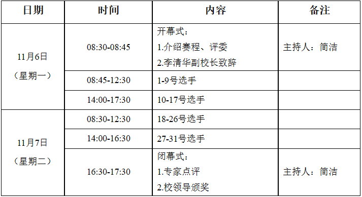 (一)各参赛选手于2023年11月3日下午到比赛地点抽签确定本人的比赛顺序及授课内容,同时拷贝和试播参赛课件,每人试播10分钟。教学课件提交后,原则上不允许改动,如在试用设备过程中发现问题,可适当更改格式,不允许更改内容。