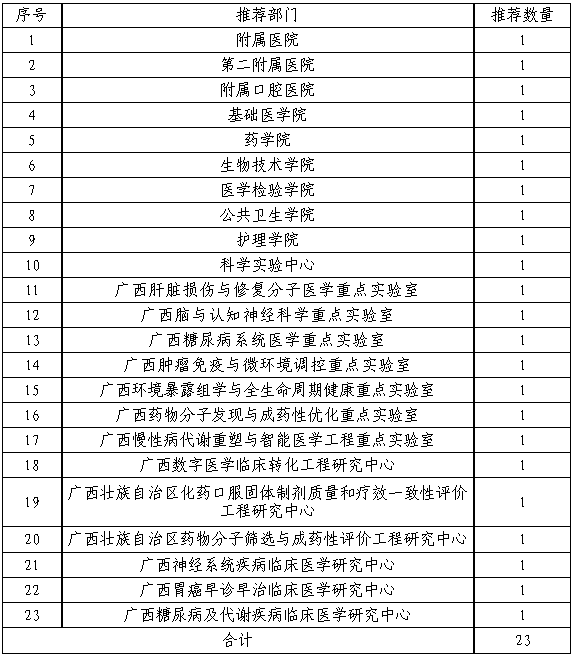 各二级学院、附属医院、自治区重点实验室、自治区工程研究中心以及科学实验中心按照名额分配表做好推荐工作。人文管理学院等二级部门自愿推荐自然科学类参赛选手。推荐选手的PPT请于11月27日前上交到科技处。