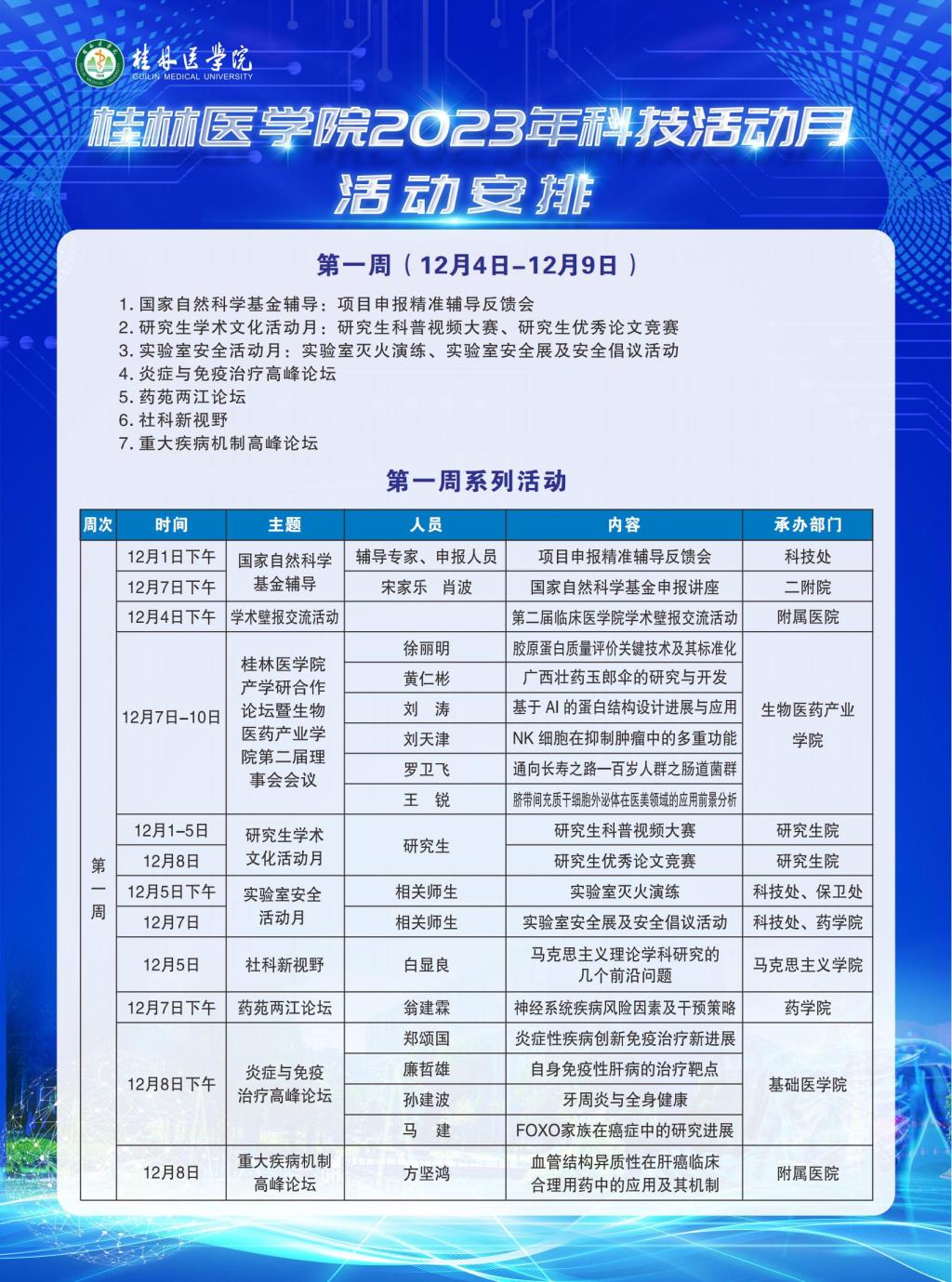 为进一步弘扬科学家精神,激励和引导我校科技工作者追求真理、勇攀高峰,促进学校高质量发展。我校2023年科技活动月于12月1日正式拉开帷幕。围绕系列主题,学校、各学院策划的项目辅导、学术讲座、高峰论坛等系列活动二十余场,现将第一周活动内容公布如下: