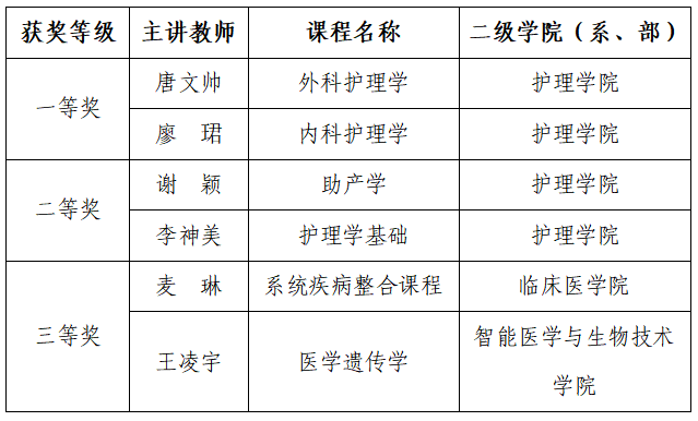 根据广西高等教育学会《关于举办第四届全国高校教师教学创新大赛广西赛区比赛的通知》文件精神,及《关于举办桂林医学院第四届教师教学创新大赛的通知》(教评〔2024〕32号)和《关于开展桂林医学院第四届高校教师教学创新大赛现场评审的通知》(教评〔2024〕33号)要求,教育评价与教师教学发展中心组织专家评委进行了网络评审和现场评审,最终评选出拟奖励教师(团队),现将名单予以公示: