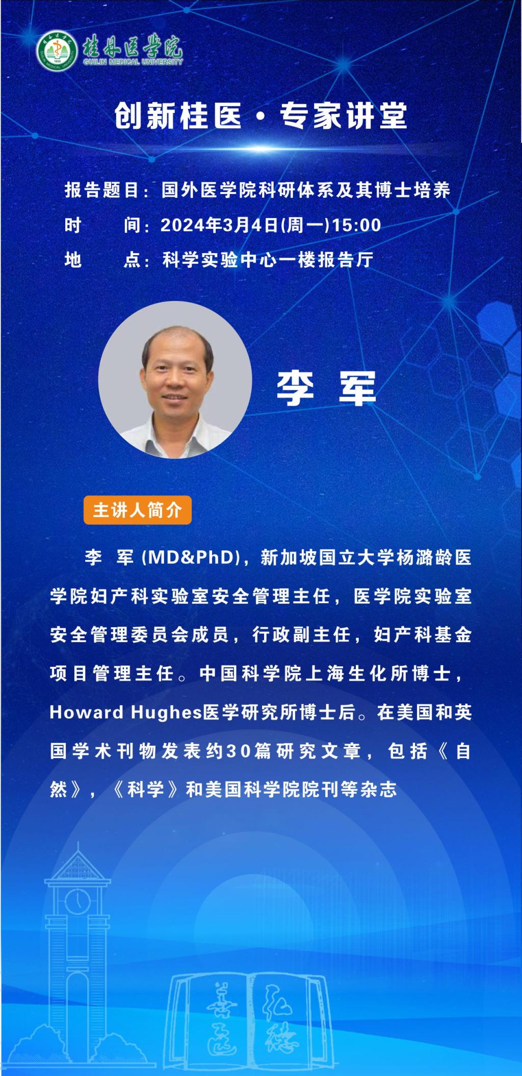 李军(MD&PhD),新加坡国立大学杨潞龄医学院妇产科实验室安全管理主任,医学院实验室安全管理委员会成员,行政副主任,妇产科基金项目管理主任。中国科学院上海生化所博士,Howard Hughes医学研究所博士后。在美国和英国学术刊物发表约30篇研究文章,包括《自然》,《科学》和美国科学院院刊等杂志。