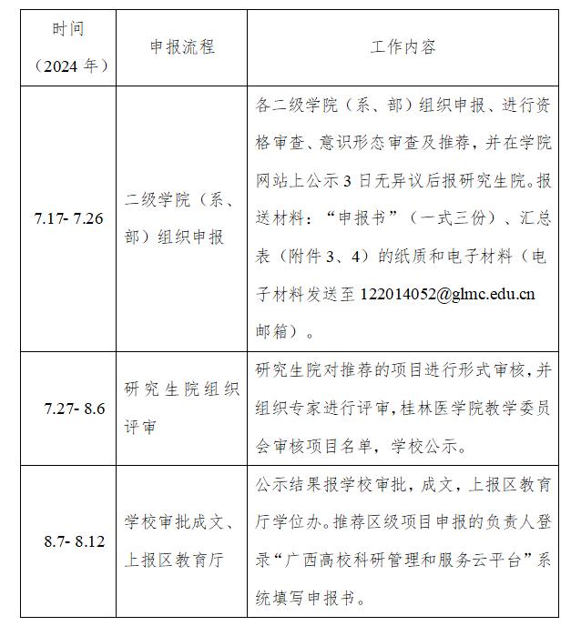 根据《自治区学位委员会自治区教育厅关于申报2024年广西学位与研究生教育改革课题的通知》(桂学位〔2024〕8号)的文件精神,结合我校实际情况,现组织申报2024年广西学位与研究生教育改革课题学位与研究生教育改革项目,现就有关事项通知如下: