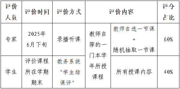 教评中心根据评选条件对二级学院(系、部)上报的推荐人选进行资格审查,并组织专家和学生对参评教师本学年所授课程(教师自选一门课程)进行评价。教师最终成绩由专家和学生评价的平均分组成,评分规则如下: