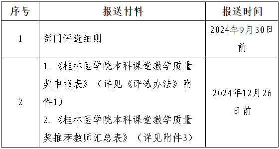 根据《桂林医学院本科课堂教学质量奖评选办法》(桂医教评〔2022〕5号)(以下简称《评选办法》,详见附件1)文件精神,学校决定开展2024-2025学年“本科课堂教学质量奖”评选工作,现将相关事宜通知如下: