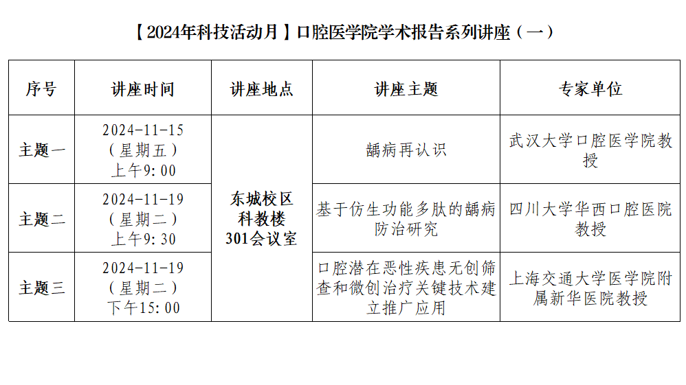 为深入贯彻落实党的二十届三中全会精神,弘扬科学家精神,加强作风和学风建设,引导求真问实,提升科研工作者和师生的科学素养,推进学校科技创新。根据学校科技活动月安排,口腔医学院将举办学术报告系列讲座,具体如下: