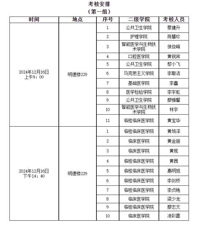 (一)考核安排见附表。请按考核顺序提前1小时到明德楼201教室签到准备。
