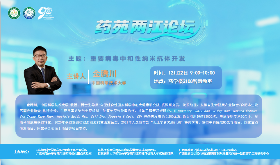 为促进药学领域学术交流、助力科研创新发展,搭建高水平学术研讨与科研合作平台,由桂林医科大学药学院、桂林医科大学生物医药产业学院联合主办的“药苑两江论坛”,定于2025年12月22日9:00—11:00在药学楼2108智慧教室举行。诚邀各位老师莅临现场,共话学术前沿,交流科研心得。具体会议安排如下: