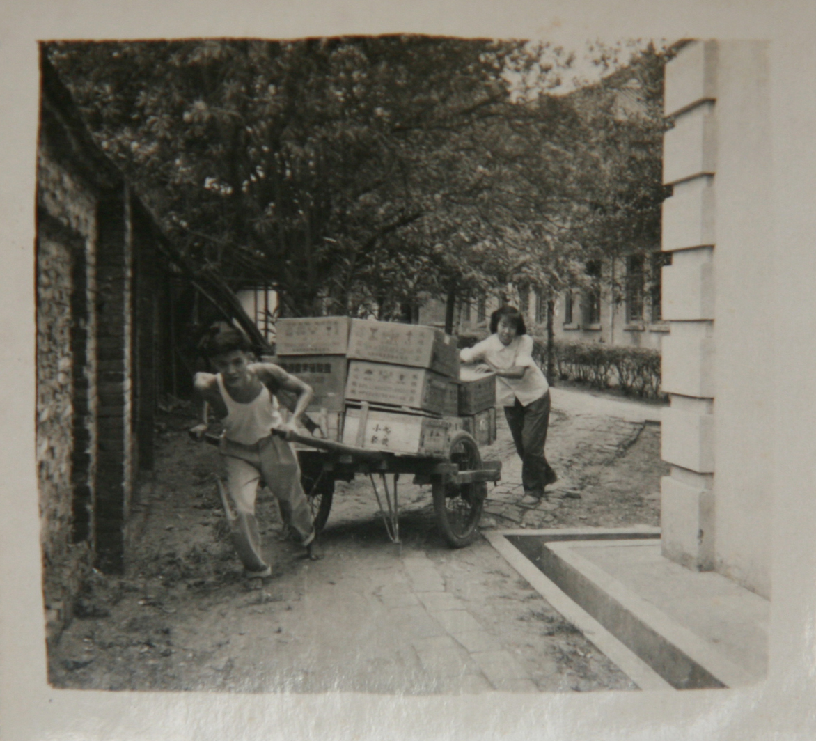 我校附属医院医院成立之初一切自力更生,图为药库工作人员自己拉车进货