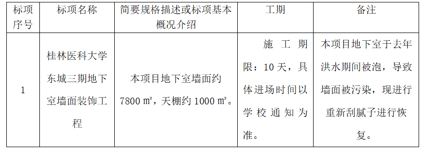 本项目地下室于去年洪水期间被泡,导致墙面被污染,现进行重新刮腻子进行恢复,需要铲除的范围及刮腻子的遍数由施工单位自行考虑。施工过程中及施工后要保持地下室其他设施设备的干净整洁。按照装饰装修相关规范进行施工,且在2年质保期内墙面不能有起皮掉皮等质量不合格现象。工期:10天,具体进场时间以学校通知为准。