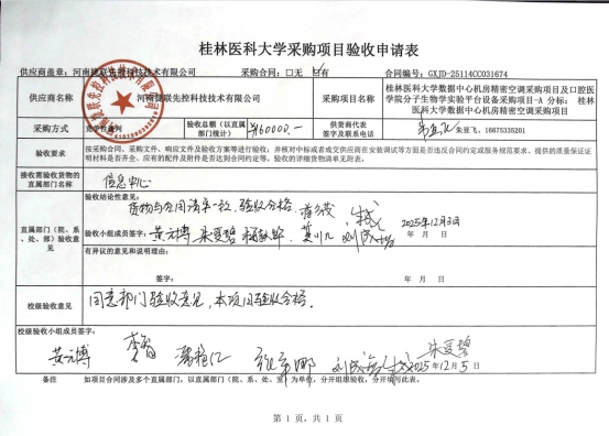 六、验收结论:经验收小组验收,桂林医科大学数据中心机房精密空调采购项目评价为合格。