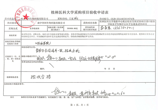 七、验收结论:经验收小组验收,桂林医科大学口腔医学院分子生物学实验平台设备采购项目评价为合格。