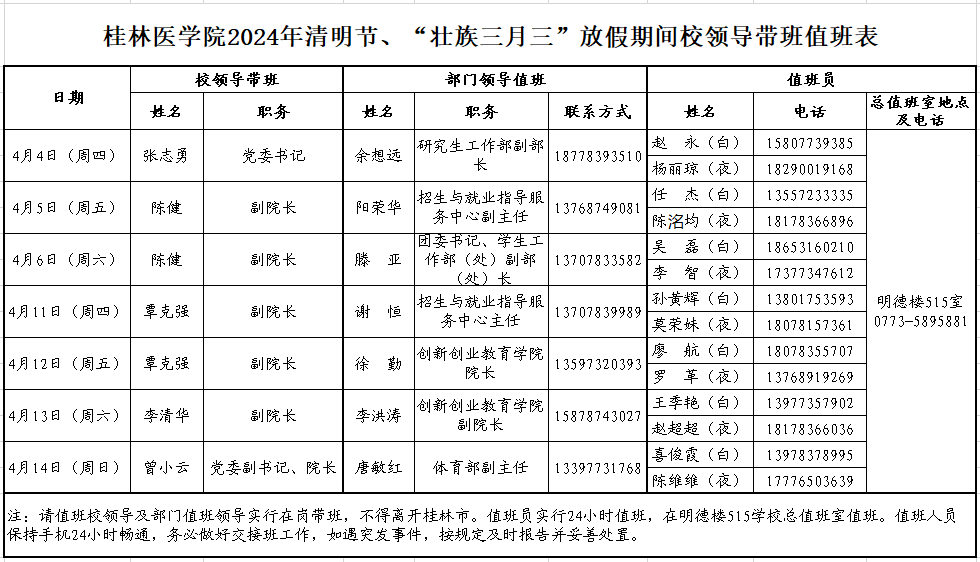 桂林医学院2024年清明节、“壮族三月三”放假期间校领导带班值班表