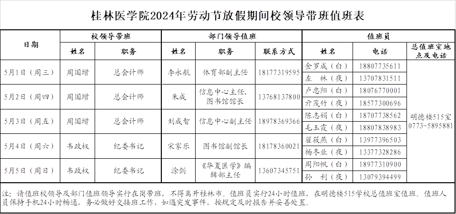 附件:桂林医学院2024年劳动节放假期间校领导带班值班表