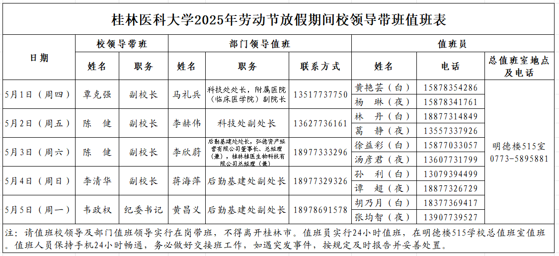 桂林医科大学2025年劳动节放假期间校领导带班值班表