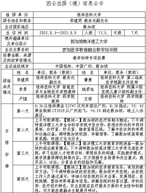 应新加坡南洋理工大学的邀请,为了解新加坡的前沿教育模式和医学教育体系,提升我校教师教学水平,经研究,我单位拟派李建周、曹慧、李勇、姚君钰、卢珺、王榕、廖珺、尹悦、方方、周小湖、梁骥、靳荷、霍鹏、曾榛、屈雅山同志于2025年08月03日至2025年08月09日赴新加坡参加教学科研。