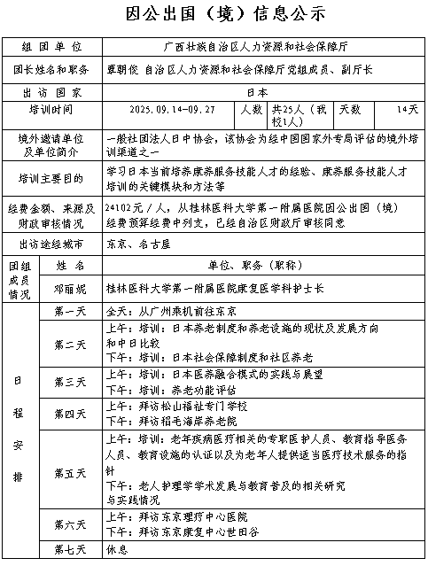 为加速培养我区康养服务技能人才队伍,应日本一般社团法人日中协会邀请,经研究,我单位拟派邓丽妮同志参加自治区人力资源和社会保障厅“康养服务技能人才及体系建设培训团”,于2025年9月14日至9月27日赴日本培训。