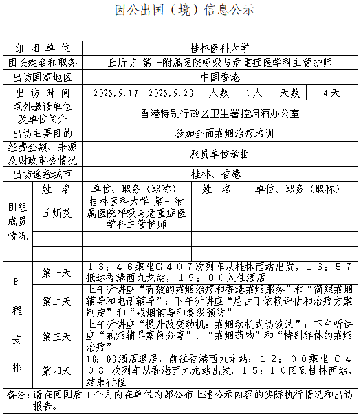 应香港特别行政区卫生署控烟酒办公室的邀请,为全面推广戒烟业务,增强我校附属医院人员的相关业务能力,经研究,我单位拟派丘炘艾同志于2025年09月17日至2025年09月20日赴香港参加培训。