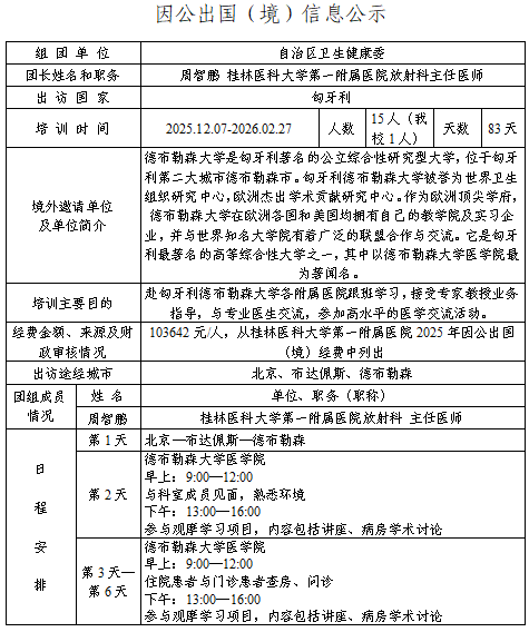 应匈牙利德布勒森大学邀请,为加强我区医学高层次人才培养,进一步拓宽卫生领域的对外交流与合作渠道,经研究,我单位拟派周智鹏同志于2025年12月7日至2026年2月27日赴匈牙利参加“少数民族地区临床医学人才培训团”项目。