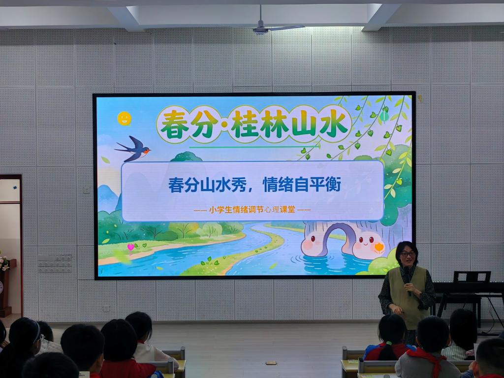 为深入贯彻教育部2026年“新春第一会”“健康第一”教育理念,落实全国两会关于加强心理健康教育、健全校家社协同育人机制的部署,发挥高校社会服务职能,持续推进大中小学心理健康教育一体化建设,3月31日下午,我校心理健康教育与咨询中心师生走进桂林市榕门小学,为五年级学生开展“春分山水秀,情绪自平衡”主题心理健康课。