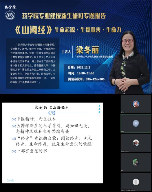 12月2日广西师范大学梁冬丽教授在云端从《山海经》是一部什么书、《山海经》书写的生命起源、《山海经》书写的生物利害、《山海经》书写的生命力等方面引导大家体悟科学人文精神、人文科学意识、科学意识的功能、人文精神的力量,涤荡心灵、升华精神。