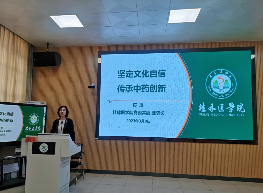 3月9日下午,校党委常委、副院长陈旭以“坚定文化自信,传承中药创新”为主题,给药学院2021级中药学本科班讲授“开学第一课”。药学院党政领导、辅导员及全体学生到场聆听。