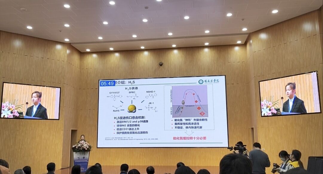 在现场答辩环节中,药学院曾巧同学作为“新型缓释硫化氢的3D打印水凝胶支架的制备和作为伤口敷料的应用研究”项目代表,语言流畅、思路清晰、反应敏捷、应答得当,赢得了评委们的一致好评,充分体现了桂林医学院药学生的风采。今后我院将以大赛为契机,以赛促教、以赛促学、以赛促建,进一步总结经验,依托药学叙事体系推进创新创业教育,不断提升药学人才培养质量。