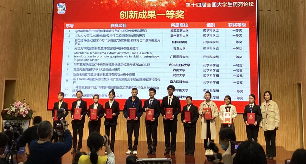 3月17-3月19日,由教育部高等学校药学类专业指导委员会主办的第十四届全国大学生“药苑论坛”在河北医科大学召开。全国大学生药苑论坛是全国高等教育药学类顶级赛事,为全国药学优秀学子提供科技创新和创业成果展示的平台,为具有创新意识的师生和医药单位搭建沟通的桥梁。此次比赛吸引了浙江大学、复旦大学、四川大学等95所高校共计225项作品参赛,参与程度达到历史新高。由药学院李迎迎老师带队的桂林医学院药学院代表队斩获“创新成果一等奖”、“创新成果三等奖”以及“优秀论文奖”3项奖励,继第十三届全国大学生“药苑论坛”获得创新成果一、二等奖后再创佳绩。