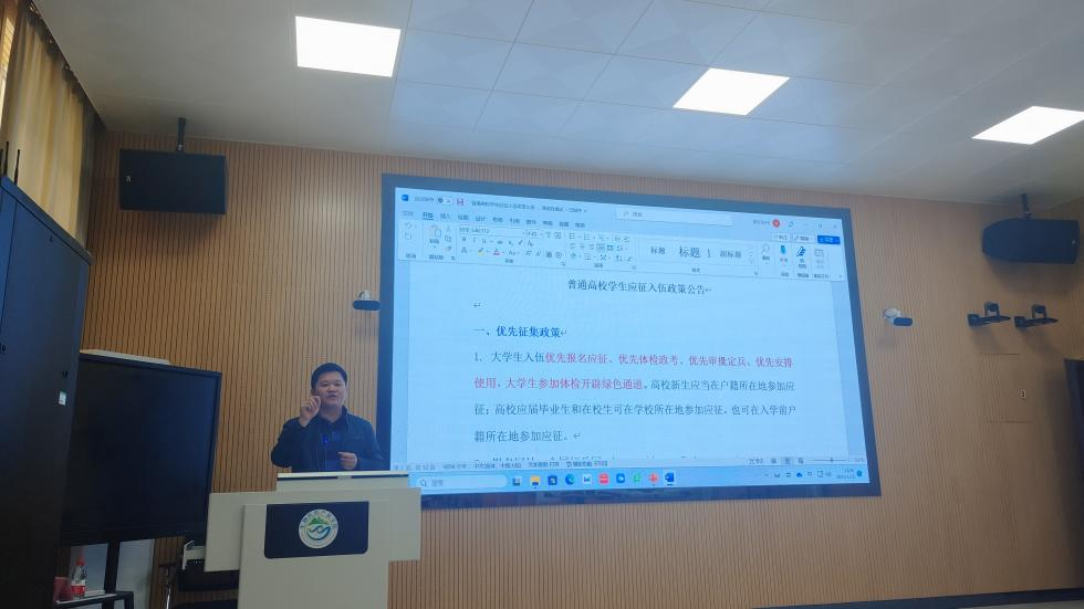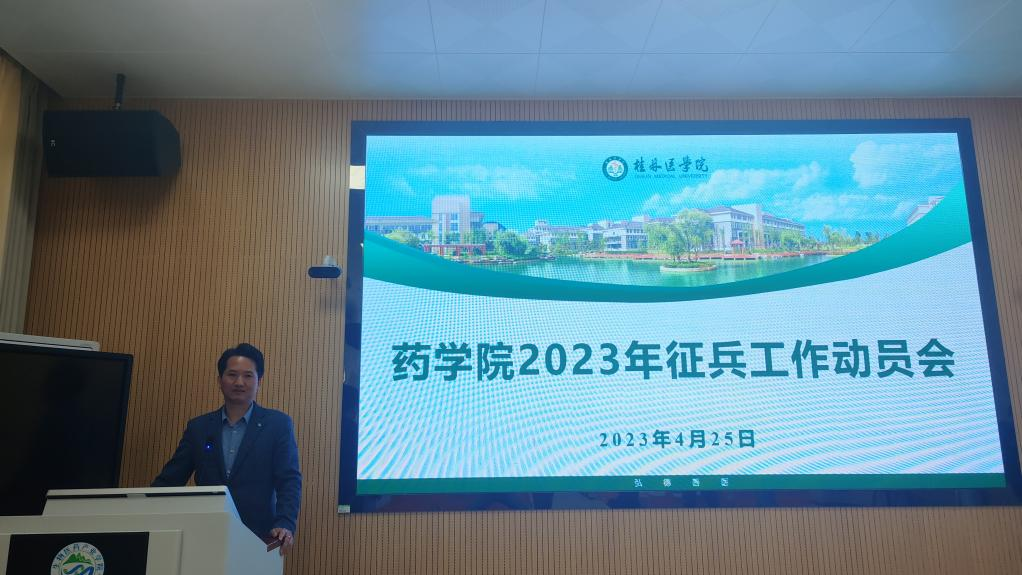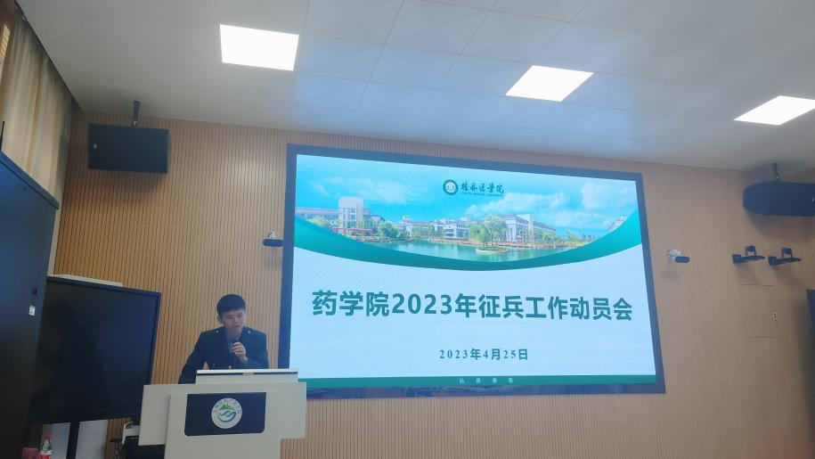 为响应党和国家对大学生征兵的号召,让同学们对军营生活和大学生应征入伍有直观的认识和详细的了解,激发同学们应征入伍,报效祖国的热情,药学院于4月25日举办了药学院2023年征兵工作动员会,出席本次会议的有药学院副院长谭亲友、学校征兵工作站征兵专员石兴镇、药学院优秀退役士兵代表李文洁、韦翔骞以及药学院毕业班学生代表。