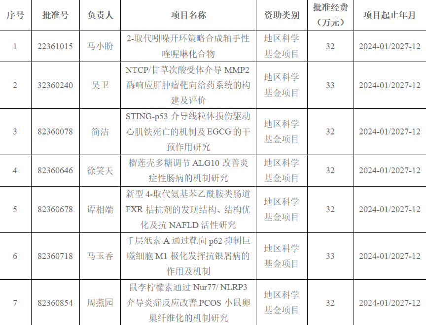 【喜报】2023年药学院获国家自然科学基金项目立项7项