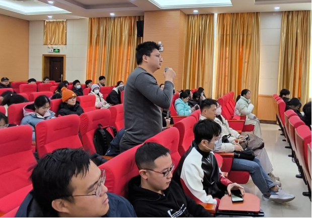 提问环节,学生就微针在疫苗中的应用前景以及中药在疫苗研发中的创新应用等问题与邹全明教授开展讨论交流,现场氛围热烈,掌声不断。讲座结束后,学生与邹全明教授合影留念。