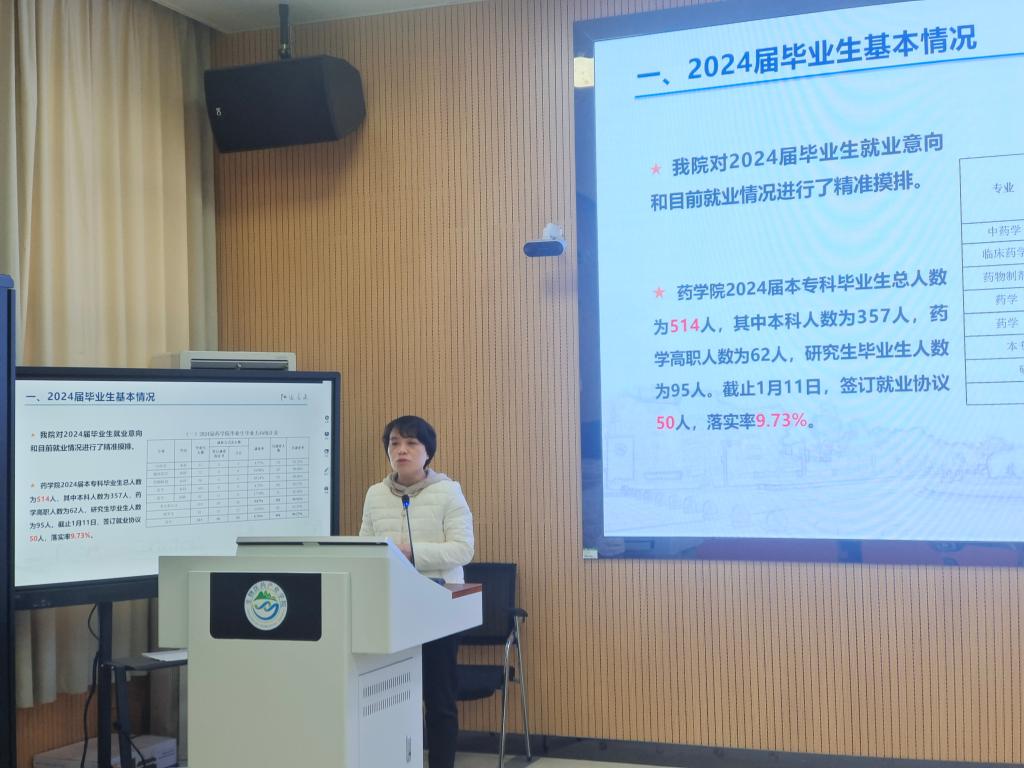 为落实学校2024届毕业生就业创业工作会议精神,多措并举为确保学生顺利就业保驾护航,1月12日上午,药学院在药学院2108会议室召开了2024届毕业生就业工作推进会。药学院党政领导、招生与就业指导服务中心领导、毕业班导师及班主任、各教研室主任、各党支部书记、全体专兼职辅导员参与了会议。会议由学院党委书记肖湘君主持。