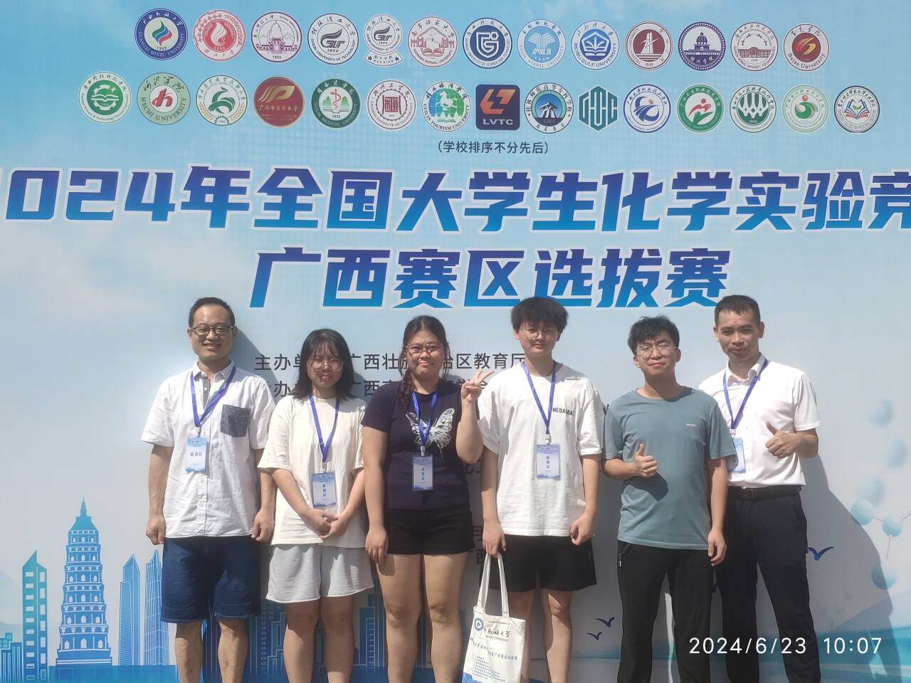 06月22日至23日,2024年全国大学生化学实验竞赛广西赛区选拔赛在广西民族大学举行,我院李芳耀副院长和桂劲松老师带领4名学生代表参加比赛。此次比赛分为实验理论及实验操作两部分,经过激烈的比拼,2022级药物制剂专业何侣同学获得有机组二等奖,2022药学本科专业王世杰同学获得有机组三等奖。我院递进式实践体系教育教学改革通过此次比赛初显成效。