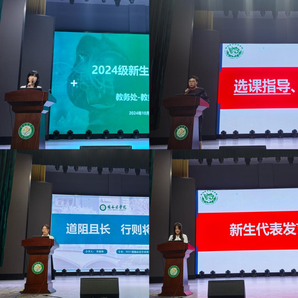 教务处教务科蒙智娟老师为同学们详细讲解了教务系统的登录和使用,并结合专业培养计划做了选课指导;教务处考试中心李尹娜老师介绍了课程考核方式和诚信考试相关规定;2021级临床药学本科班农丽仙作为老生代表从大学生活、专业学习、社会实践等方面讲述了自己的经验和感悟;新生代表黄雯雯同学提到希望新生同学们一同做到自立自律自信,在自己大学生活开学之际,树立正确理想,定好明确目标,砥砺前行,不负青春!
