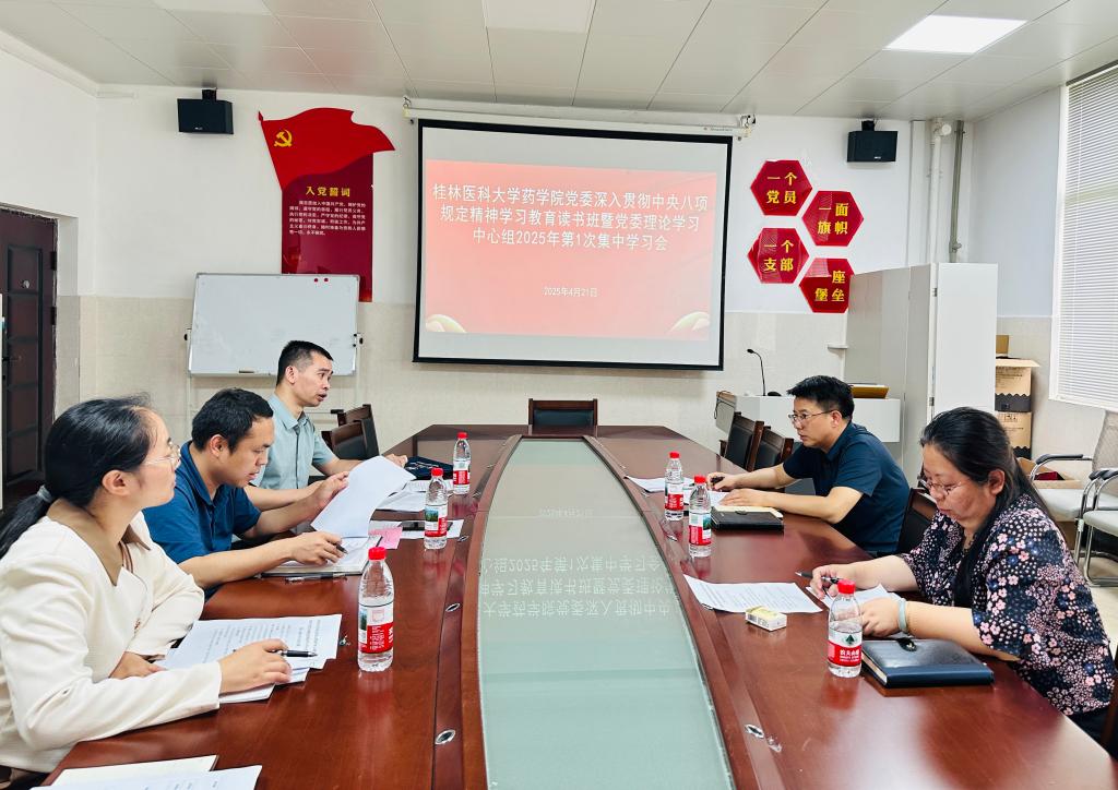4月21日,药学院党委在药学楼1301会议室召开深入贯彻中央八项规定精神学习教育读书班暨党委理论学习中心组2025年第一次集中学习会。学院党委委员参加会议,会议由药学院党委书记韦日明主持。