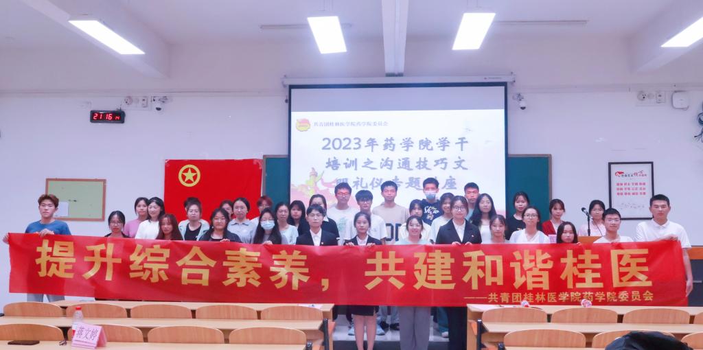 为了给每个学生干部有益的指导与帮助,促进个人能力的提升,提高各学生干部处理困难的能力,增加经验、明确职责,共青团桂林医学院药学院委员会于2023年11月3日19:00在N303举办药学院学生干部培训之沟通技巧交流、文明礼仪专题讲座。药学院团委书记廖航老师、副书记伍彩红老师、学工办蒋文婷老师作为嘉宾出席本次讲座。