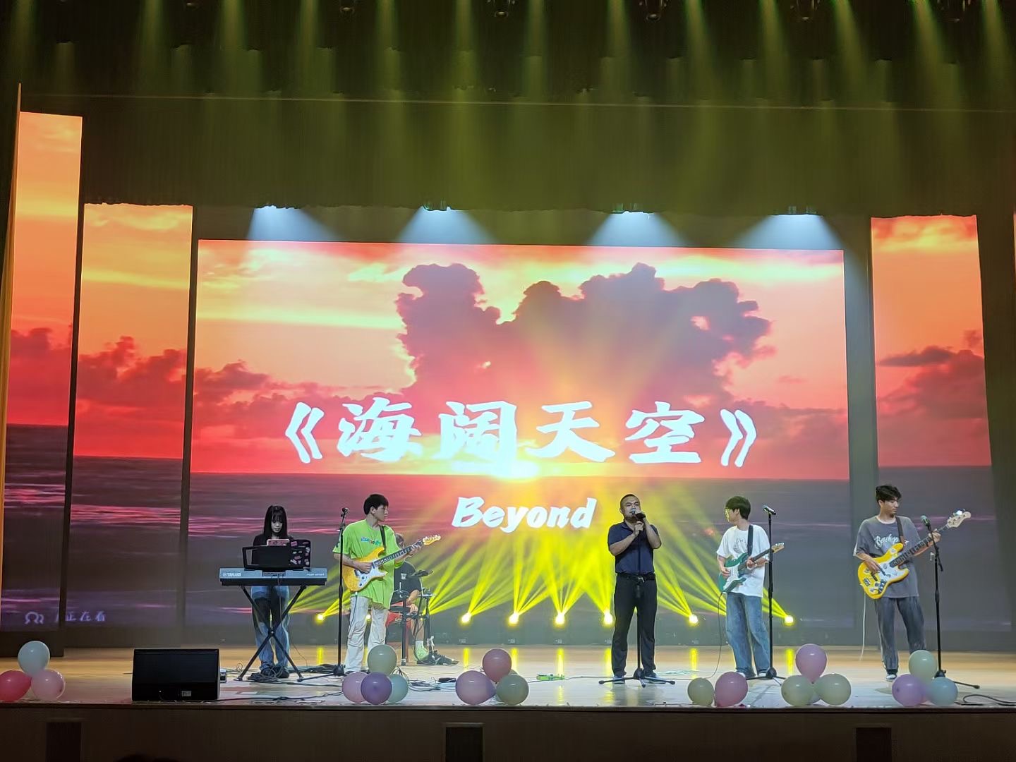 特邀嘉宾师专微醺乐队的《鲜花》和《梦特别娇》伴随着动感的旋律,如同黑夜的一道荧光,照亮了晚会的序幕。紧接着,杨扬老师带领90后王榕老师、秦思媛老师和00后同学献唱《无名之辈》,饱含对毕业生们深切的期望和鼓励;一只麦,一首《真的爱你》,一首《海阔天空》,张业老师以炫酷的台风和热情的互动瞬间点燃全场气氛,每字每词都充满爆发力,如同擂鼓般激荡起大家心中的层层波澜。