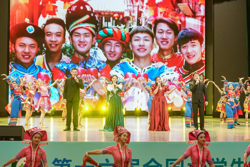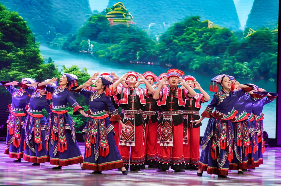 桂林师范高等专科学校同学们带来的歌舞《逐梦》,伴随着青春的舞步启航,拥抱梦想的曙光;颇具壮乡特色的《刘药师智斗三秀才》、表演唱《桂海春歌》、舞蹈《打扁担》等节目,同学们用独有的桂林彩调,悠扬的歌声,富有韵律的舞步,描绘出一幅幅有声有色的画卷,在舞台铺展开来,尽显八桂大地多姿多彩的民族风情。演员们以满怀的深情,展现出壮乡各族人民对这片土地的热爱。晚会在全体演员共同参演的歌舞《母亲是中华》中圆满落幕,各族人民携手高歌,用深情表达对中华民族大家庭的深深眷恋与祝福。