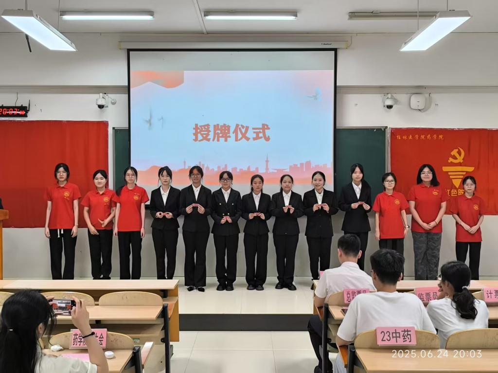 2025年6月24日19:00,药学院“红色阵营”在临桂校区楼南楼304教室召开了药学院“红色阵营”第十九次学生干部换届大会,药学院党委副书记李芳耀、各二级学院和班级代表及“红色阵营”全体成员出席了本次活动。