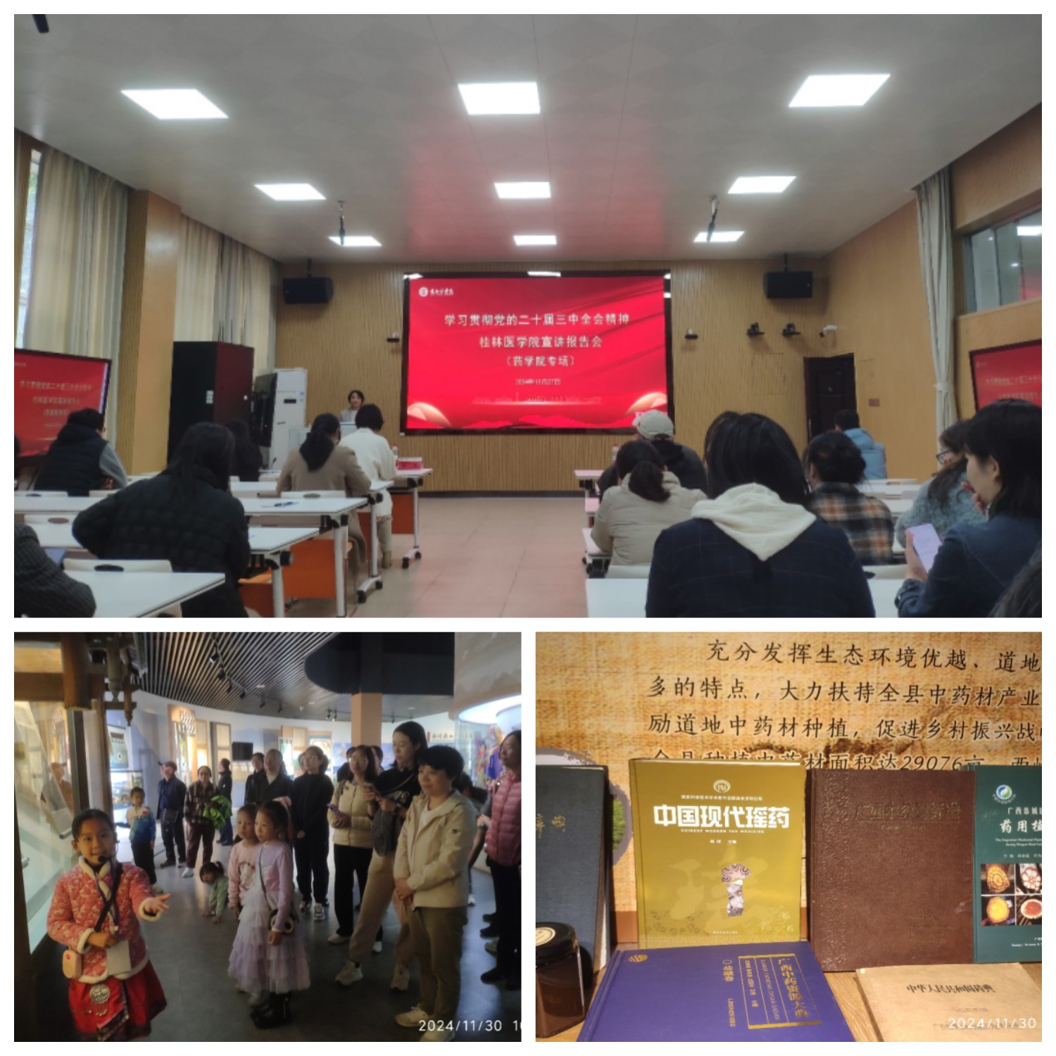 为加强药学院分工会职工小家建设,提高会员政治素养,丰富药学院教职工生活,给大家提供一个健康、快乐、和谐的工作氛围,增强全院职工的凝聚力,药学院分工会于2024年11月27日学习贯彻党的二十届三中全会精神。11月30日参观恭城博物馆,熏陶民族文化。12月3日组办趣味游戏活动。