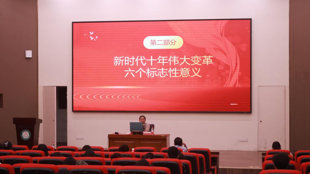 药学院党委副书记谭钦刚应邀讲授《领悟新时代十年的伟大变革》主题团课,将新时代十年的三件大事、标志意义、具体内容、伟大斗争、发展方向等方面进行了全方面的阐述。他授课风趣幽默,善于从国内和国际中具有影响力的大事件进行分析对比,不断引领青年用习近平新时代中国特色社会主义思想的世界观及方法论,来认识自己、认识世界,把握未来成长方向,在实现中华民族伟大进程中贡献青春力量!
